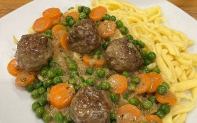 Hackbällchen in Erbsen-Möhren-Rahm mit Spätzle