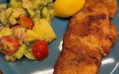 Zutaten: Für die Schnitzel: Hähnchenschnitzel Mehl Eier Semmelbrösel Salz und Pfeffer Öl zum Braten Für den Kartoffel-Gurkensalat: Kartoffeln Gurken Zwiebeln…