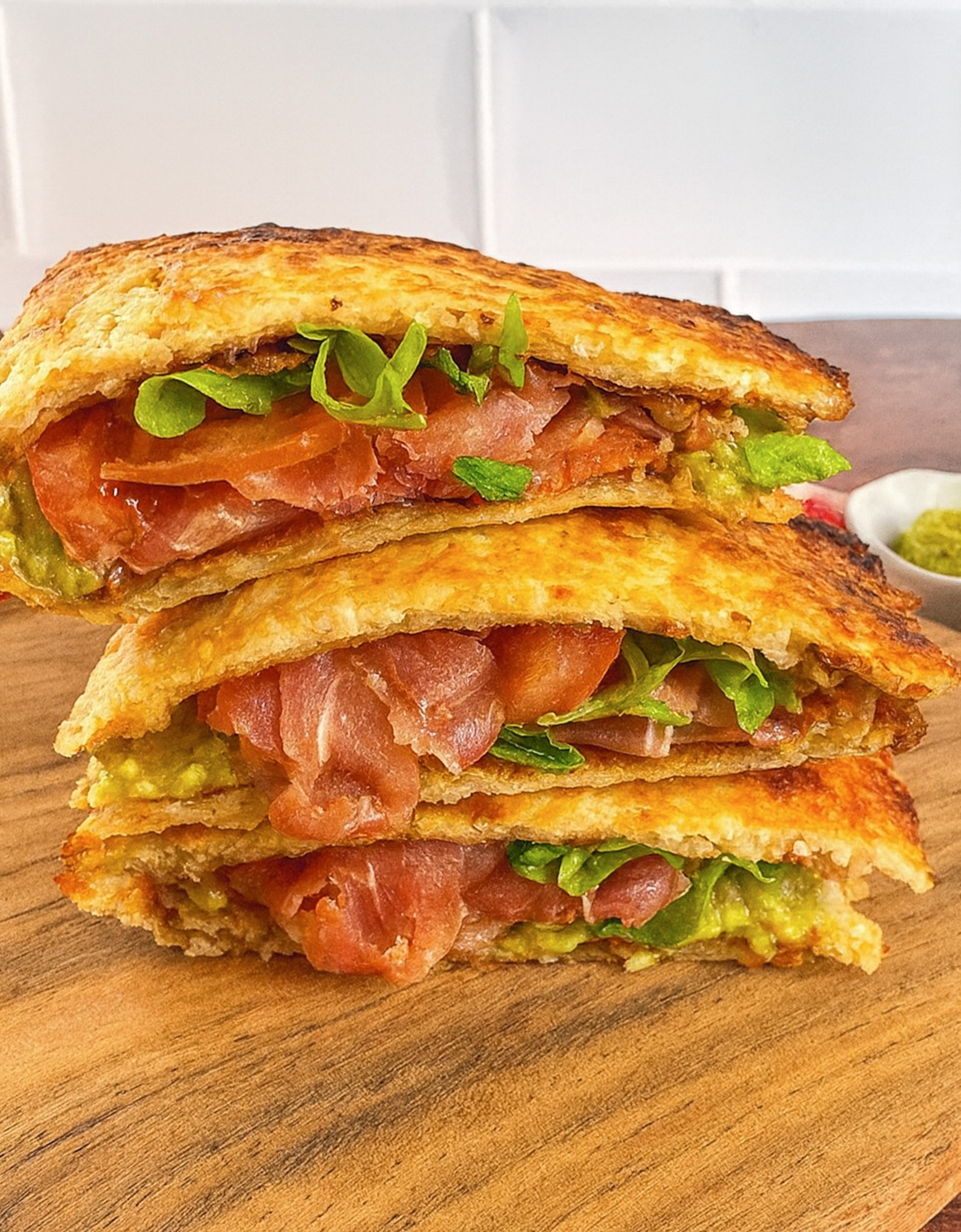 Zutaten Deiner Wahl (wir haben Guacamole, Salate, Tomate, Schinken und Basilikum verwendet)
